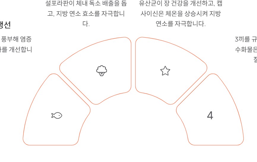 브로콜리는 설포라판이라는 항산화 물질이 풍부해 체내 독소 배출을 돕고, 지방 연소 효소를 자극하는 역할을 합니다. 식이섬유도 많아 포만감 유지에 좋고, 칼로리는 낮아 다이어트 식단의 단골 채소이기도 하죠. 살짝 데쳐 샐러드로 먹거나, 오븐에 구워 간단한 반찬으로 활용해보세요.