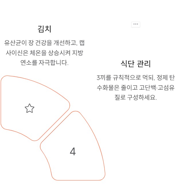 발효식품인 김치는 유산균이 풍부해 장 건강을 개선하고, 장내 유해균 억제를 통해 내장지방 축적을 줄이는 데 효과적입니다. 특히 매운맛을 내는 캡사이신은 체온을 상승시켜 지방 연소를 자극하죠. 단, 짠맛이 강한 시판 김치보다는 직접 담근 저염 김치나 백김치를 추천합니다.
